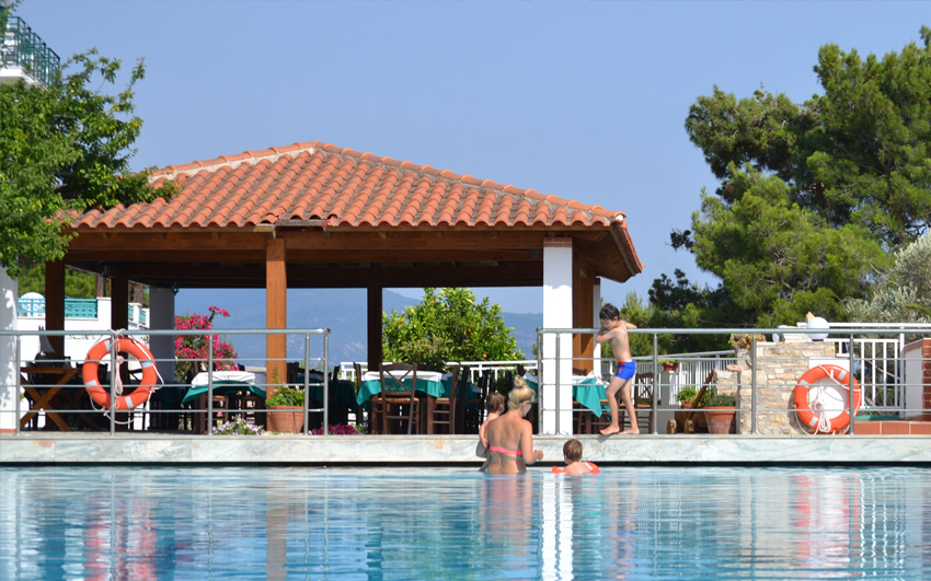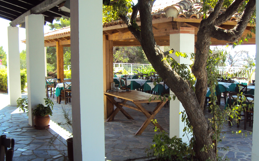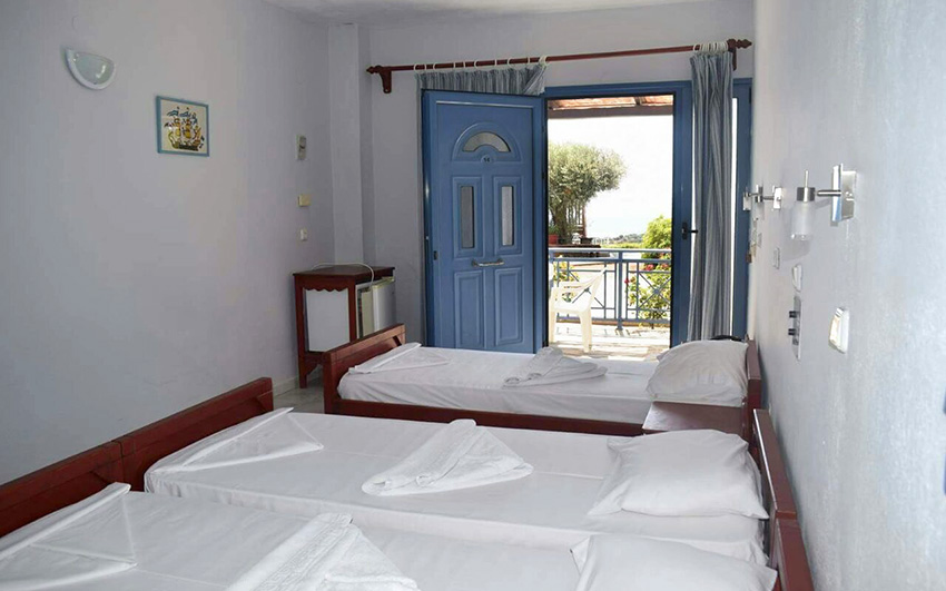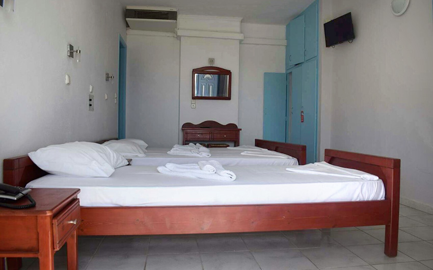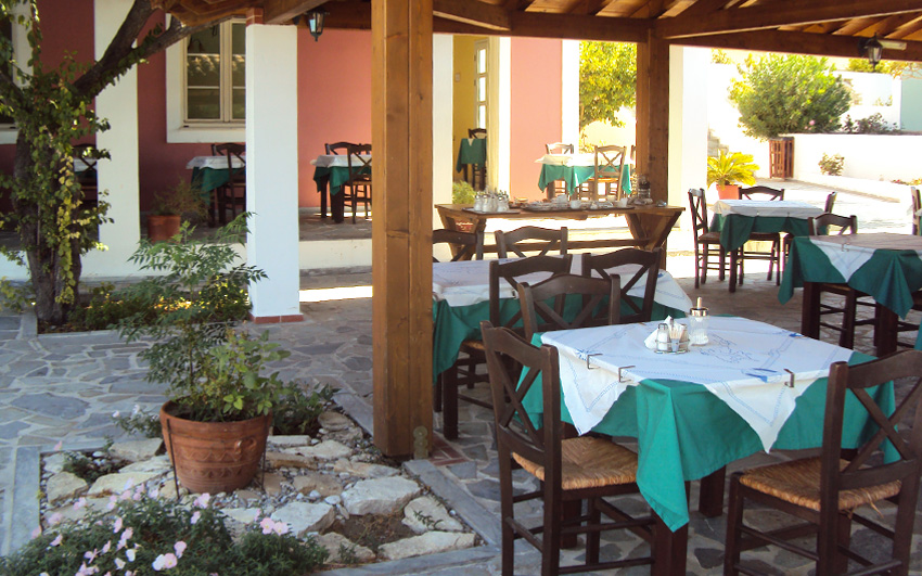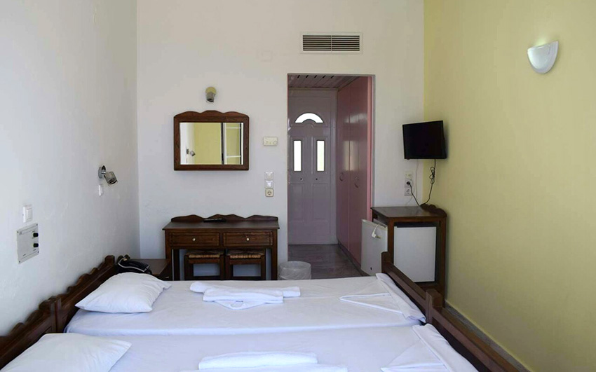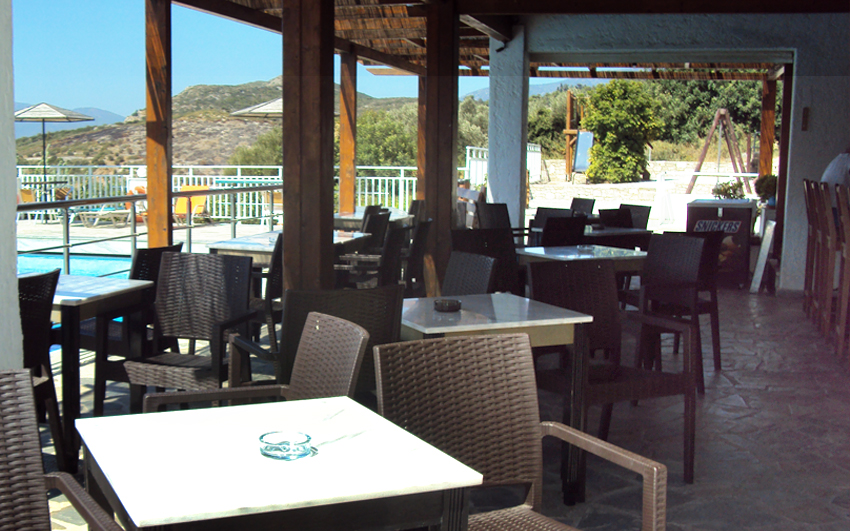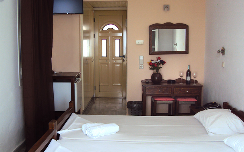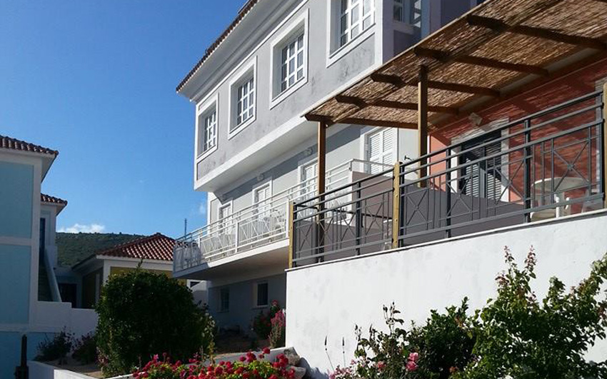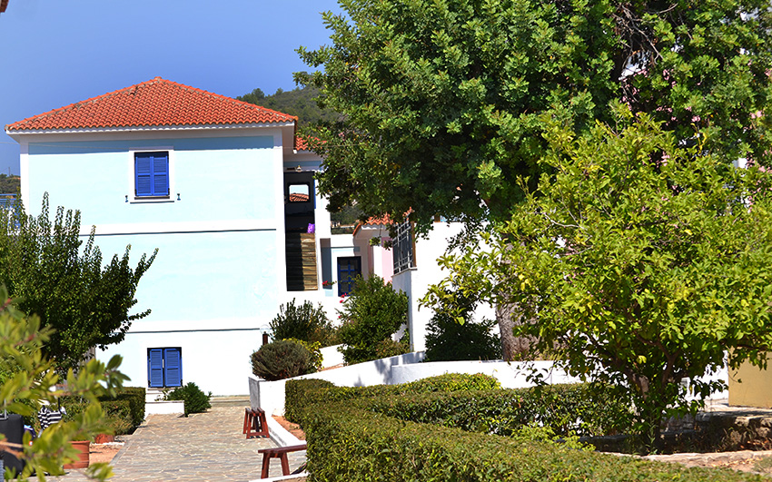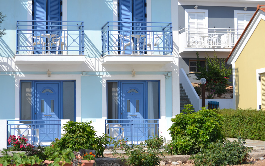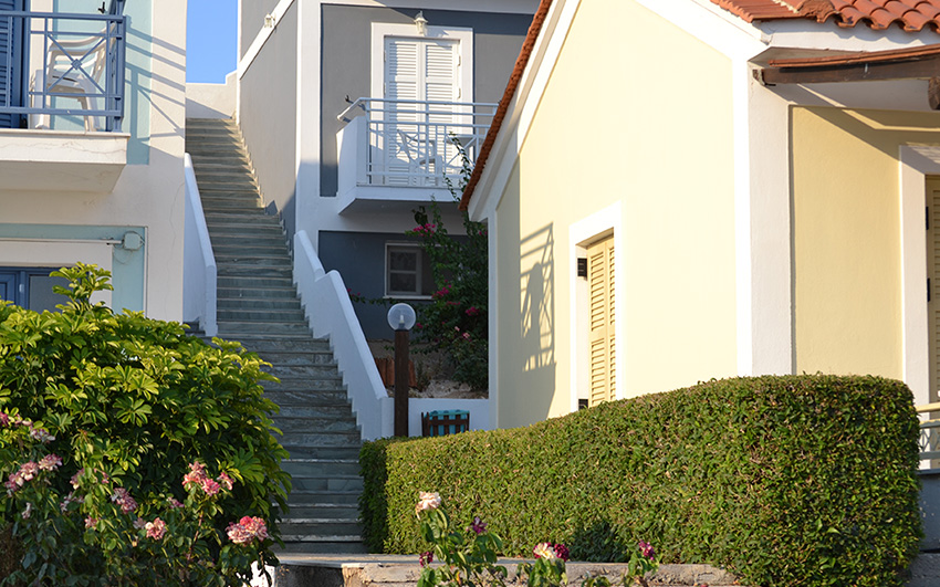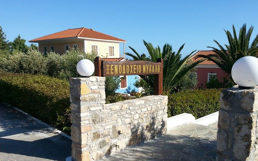 Hotel Mykali ist ein Komplex, aufgeteilt in 2 Bereiche. Insgesamt 10 Gebäude (aufgeteilt in je 5 Gebäude rechts und links vom Haupthaus) und in der Mitte steht das Hauptgebäude.